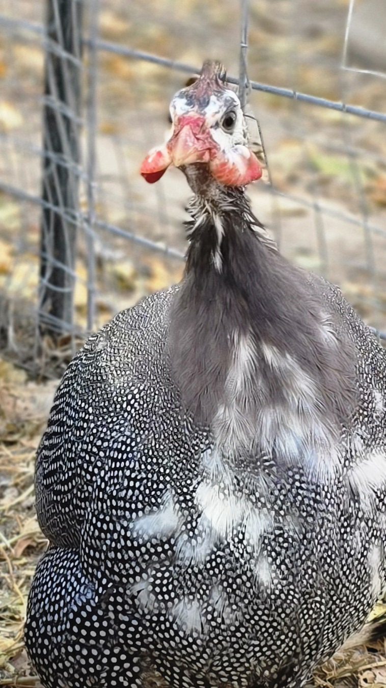 When fully grown, pied guineas have white in the chest, wing and, sometimes, the back area.